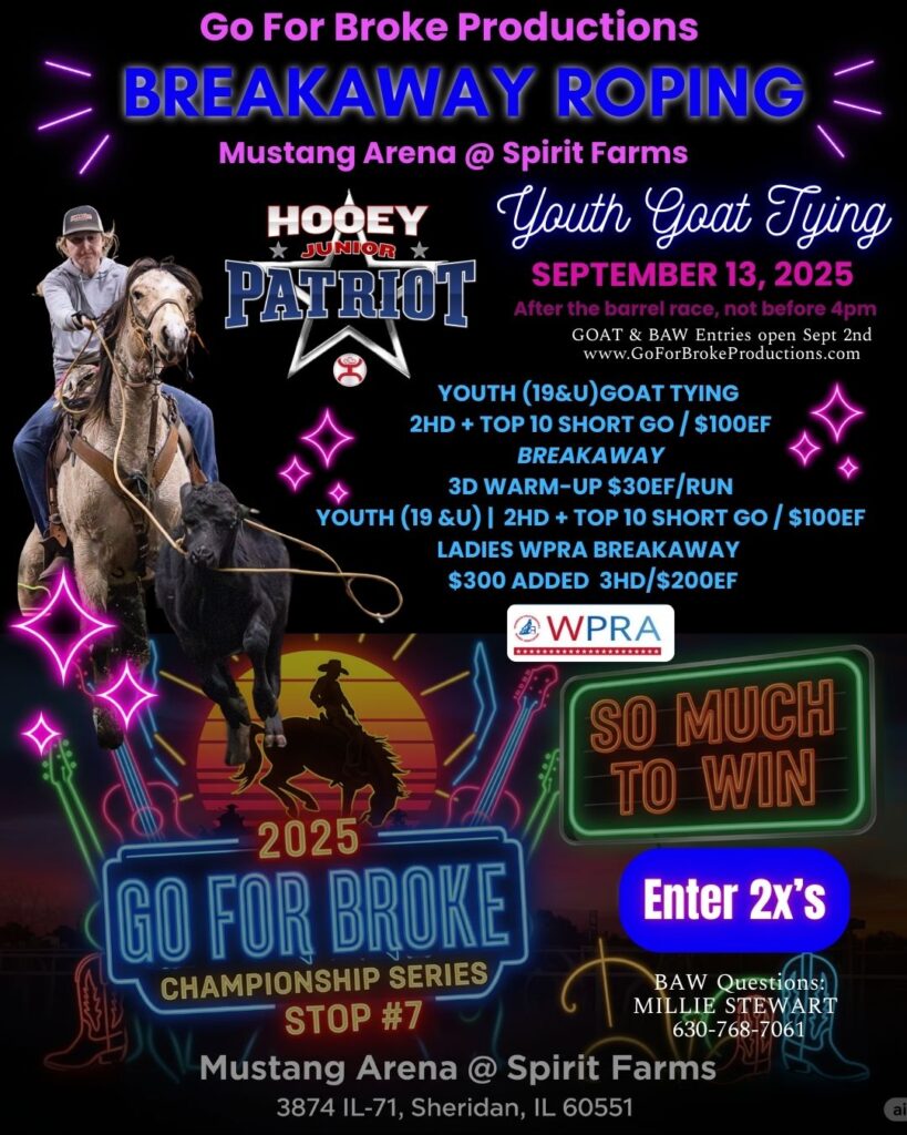 | SAT BREAKAWAY ROPING $300 Added Ladies WPRA | Warm Up $30 3HD-Youth (18&u) $100ef 3HD-Ladies WPRA Open $200ef | Breakway entries via Google Form open September 3 @12p – link will be HERE HOOEY JR PATRIOT |