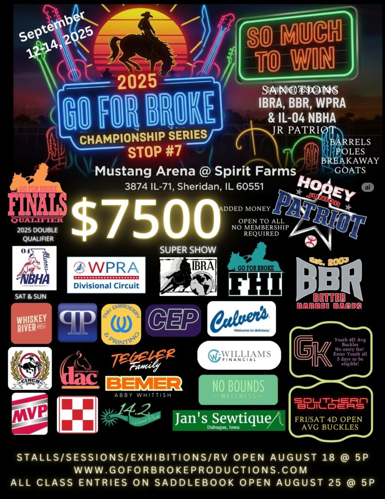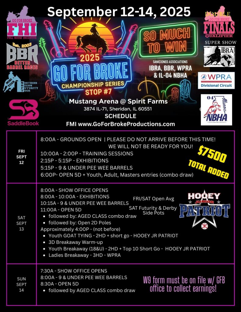| REFUNDS CAN BE REQUESTED Office fees and transaction fees are NON-REFUNDABLE. All refunds are subject to – 3% convenience fee. Refund request MUST be made by EMAIL no later than Monday 12p cst (noon) week of event. Spots may be bought/sold subject to the deadlines listed above. | Contact Go For Broke: Lynde Johnson 515-571-4281 EMAIL GO FOR BROKE YOU MUST HAVE A W9 FORM ON FILE WITH THE GO FOR BROKE OFFICE TO COLLECT EARNINGS! FORMS ARE AVAILABLE TO FILL OUT AT THE SHOW OFFICE. OR YOU CAN PRINT AND FILL THEM OUT AT WWW.IRS.GOV/W9 CHECKS ARE MARKED VOID AFTER 60 DAYS. ANY CHECK RE-ISSUED AFTER 60 DAYS WILL BE SUBJECT TO A $20 RE-ISSUE FEE. CHECKS OLDER THAN 90 DAYS WILL NOT BE RE-ISSUED FOR ANY REASON. | 100% payback of added Money Open class 75% of EF after association fees. Aged classes/side pots/poles jackpot 80% of EF after assocation fees. Breakaway & Goats Stock charges apply. Classes approved with NBHA / IBRA will have association run money deducted from entry fee |